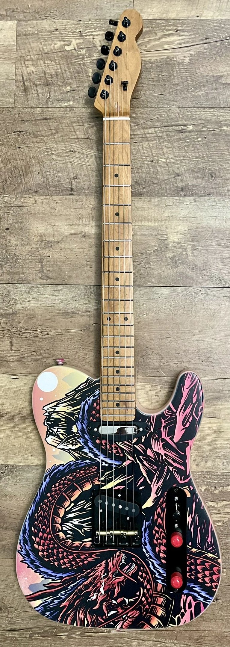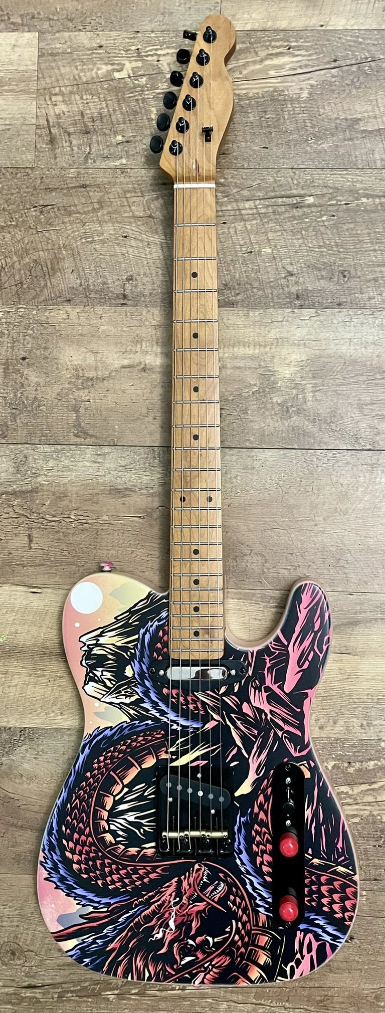 I'm testing out an additional way of adding art to some guitar bodies and making a few different printed designs. I love hand painting, but it takes a long time to create a one-of-a-kind guitar. I also wanted to be able to offer people something really nice that is still special, at a very limited quantity.